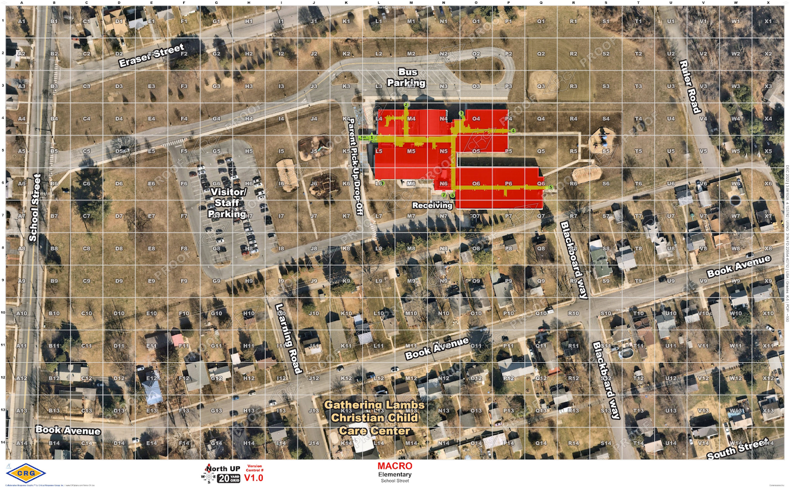 Built for a structure’s campus and grounds, MACRO™ CRGs combine a gridded overlay with Critical Incident Mapping Data (CIMD) such as current overhead imagery with accurate labeling for parking areas, athletic fields, surrounding roads, and neighboring properties. First responders and building administrators use Macro™ CRGs to coordinate crisis response external to a structure, including inner and outer security perimeters, ambulance staging areas, command posts, reunification areas, and more.