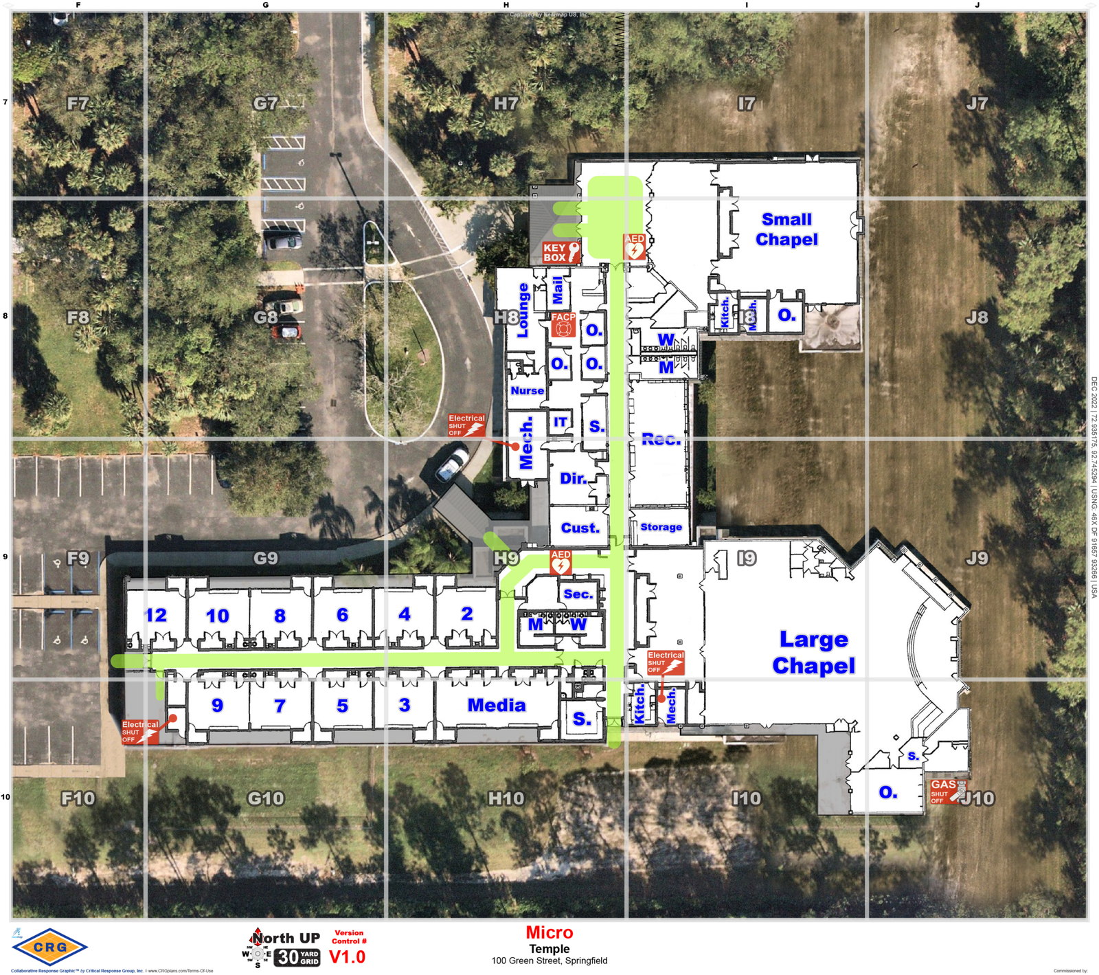 Each religious group has unique names for specific locations in their places of worship such as the rectory, chapel, meeting center, and more. CRGs enable emergency response teams to take any guesswork out of building an action plan by starting from a shared graphic.